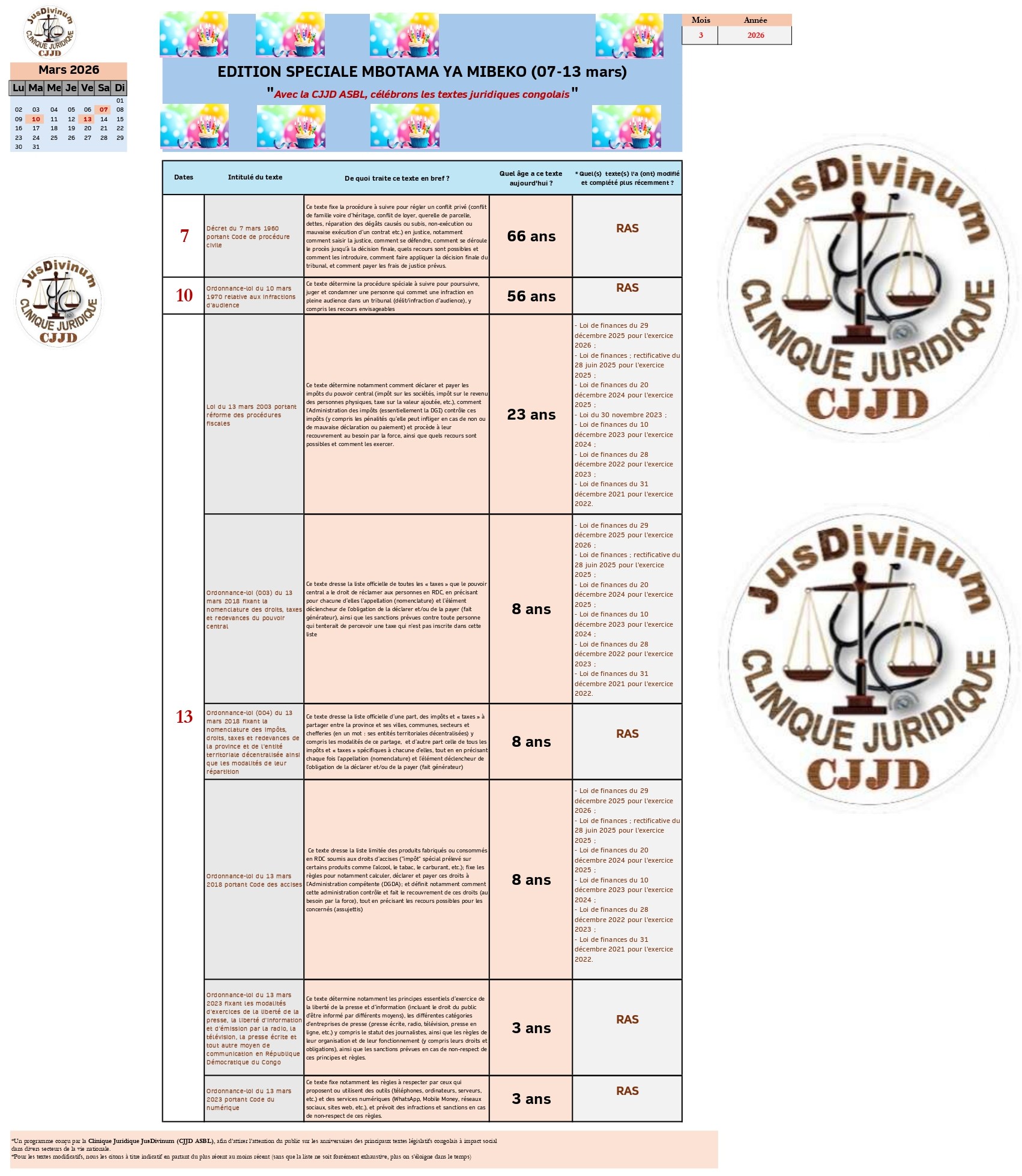 La Clinique Juridique JusDivinum (CJJD ASBL) est une organisation à but non lucratif, dont l’objectif principal est la vulgarisation du droit congolais, en en simplifiant la compréhension à travers divers supports de vulgarisation.